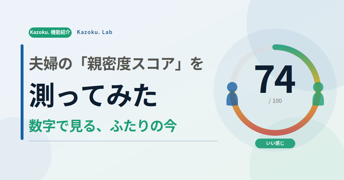 「最近、ふたりの関係は良い方向?それとも、ちょっと離れてきてる?」——感覚ではなんとなくわかっていても、言葉にしづらいもの。Kazoku.の「親密度スコア」は、それを**0〜100の数字**で見える化する機能です。