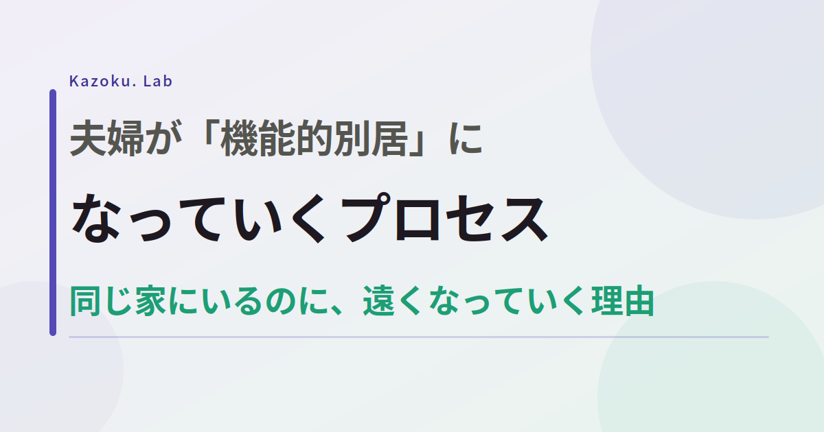 同じ家に住んでいる。生活費も共有している。子どもの話もする。でも、ふたりの間にどこか薄い壁がある気がする——。 これを「機能的別居」と呼ぶことがあります。物理的には一緒にいるのに、感情的・精神的にはすでに別居に近い状態です。けんかをしているわけでも、嫌いになったわけでもない。ただ、ふたりの間の「つながり」が、気づかないうちに薄くなっている状態です。 この状態は、ある日突然やってくるわけではありません。少しずつ、段階を踏んで進んでいきます。