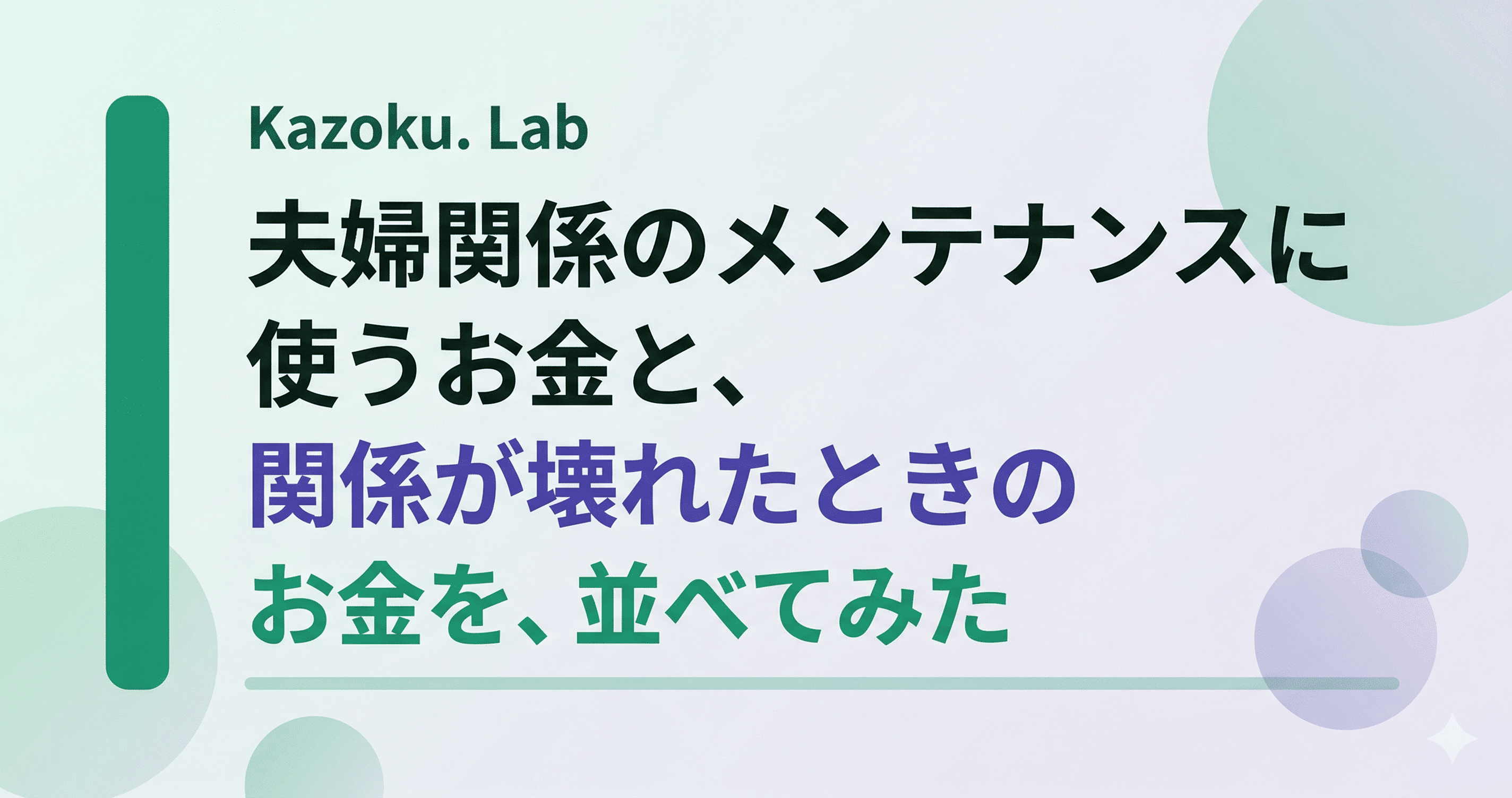 「夫婦関係のために何かお金を使う」と聞いて、どんなことを思い浮かべますか? たまの外食、旅行、カウンセリング——どれも「なくてもいいもの」と感じてしまいがちです。忙しいと、そういったことへの出費は後回しになりがちです。 でも、ふたりの関係が少しずつ壊れていくプロセスには、思っている以上のお金が動きます。この記事では、「関係を保つためにかかるコスト」と「関係が壊れたときにかかるコスト」を並べて整理してみます。
