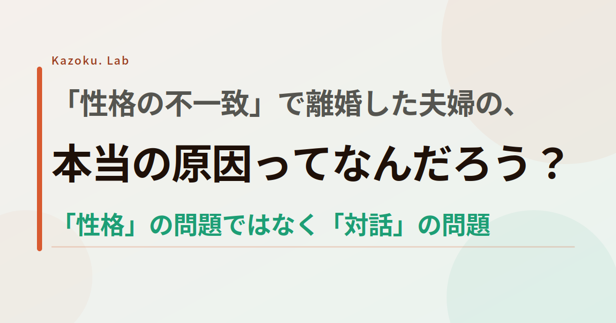 離婚の理由を聞くと、最も多く返ってくる言葉が「性格の不一致」です。 司法統計によると、離婚動機の1位は男女ともに「性格の不一致」で、年間数万件にのぼります。でも、これだけ多くの夫婦が「性格が合わなかった」と言うとき、その言葉の中身は本当に「性格」なのでしょうか。 「性格の不一致」はとても便利な言葉です。説明しにくい複雑な事情を、ひとことで包んでくれます。でも同時に、本当に何が起きていたのかを見えにくくしてしまう言葉でもあります。